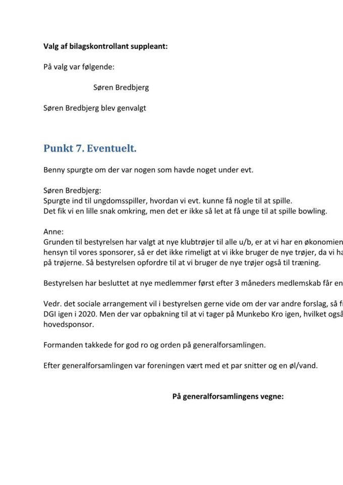 Formandens beretning: Der er sket en del forandringer i bowlingunionen, den vil blive opdelt i 2 kredse, en Øst kreds og en Vest kreds hvori Fyn indgår. Det betyder at dem der spiller i fynsserien kommer til at køre til både Kolding og Vejle.